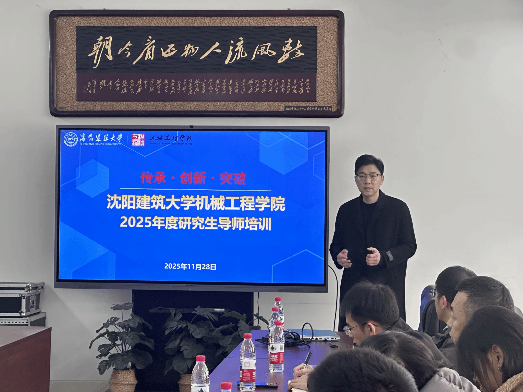 上午的培训会上,张啸尘首先讲述了研究生培养的重要性,肯定了导师作为研究生培养第一责任人,肩负着培养高层次创新人才的崇高使命。随后,费烨教授以“躬耕教坛,从上好一门课做起”为题,以自身讲授《流体力学与液压传动》课程的经验为切入点,从教学不等于教育的核心要素出发,为导师们解析了如何以课堂为基石,筑牢研究生培养的基础环节。接着,王展教授结合自身经验,围绕“如何当好研究生导师以及个人科研成长之路”展开分享,阐述了学院各研究方向的发展历程与特色优势,总结了青年教师在各类项目申请中的注意事项与宝贵经验,为导师们的项目申请和科研发展提供了实用参考。最后,田大可教授聚焦“研究生创新思维和创新能力培养浅谈”,从创新人才培养的核心需求出发,讲述了如何培养研究生创新思维能力和如何做好课题组的学生日常管理,并给出了具体的培养路径与方法建议。三场讲座内容层层递进,既有理念引领,又有实践指导,让在场导师受益匪浅。